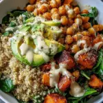 Assemble Your Bowls: Divide the cooked quinoa evenly among four bowls. On top, arrange the roasted sweet potatoes, crispy chickpeas, fresh spinach, and sliced avocado. Drizzle the tahini yogurt sauce generously over everything, adding more if you like!