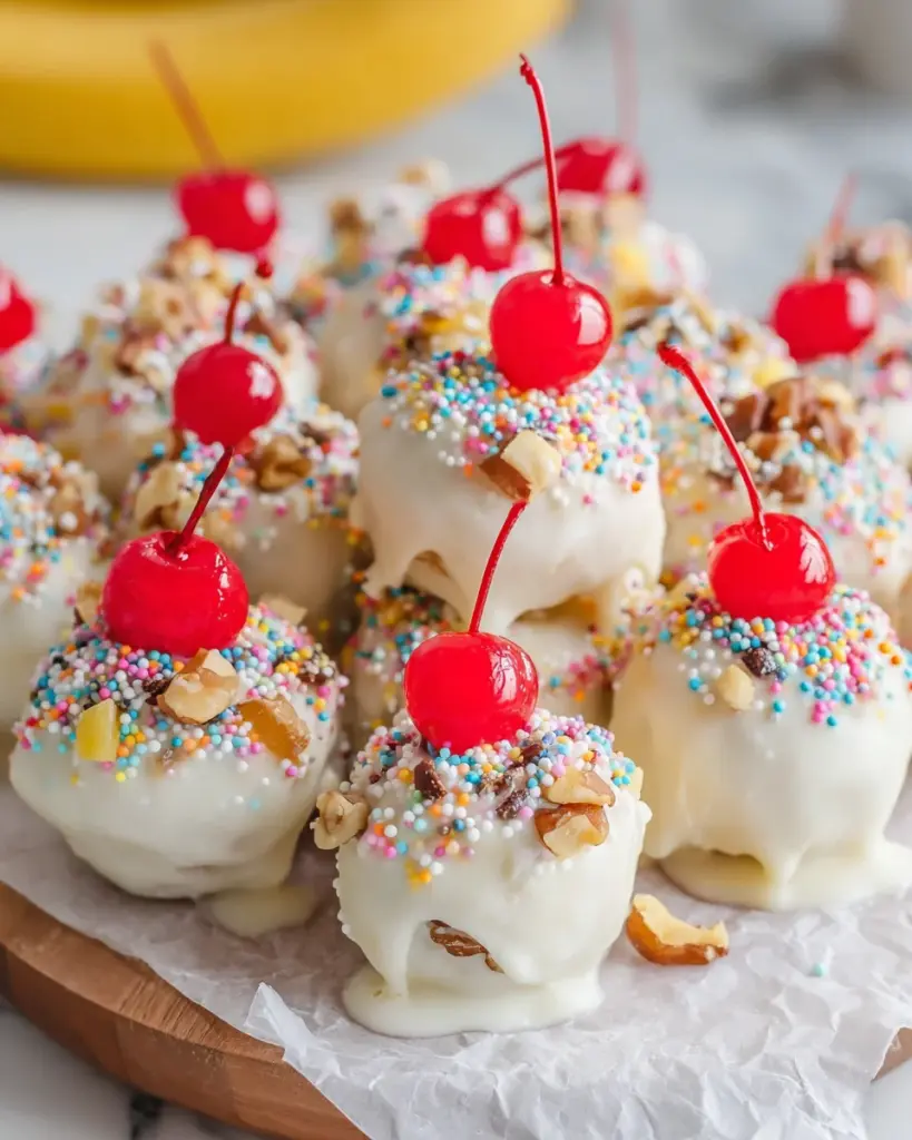 - Spoon a small dollop of melted chocolate atop each truffle, place a stemmed maraschino cherry, and sprinkle with rainbow sprinkles.