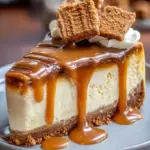 A luxurious cheesecake with a crumbly Biscoff cookie crust, smooth cream cheese filling, and a drizzle of salted caramel, offering a delightful balance of sweet and savory flavors.