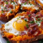 This breakfast sweet potato feels both indulgent and wholesome. It weighs light on the conscience while offering comfort to the soul: the tender, almost custardy sweetness of the potato, the punch of peppered bacon, and the molten cheese that strings with each fork lift. If you crave a breakfast that looks elegant but comes together with homey simplicity, this is the one — and if you need inspiration for a heartier version, try the high-protein stuffed breakfast sweet potatoes for a protein-packed twist.