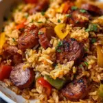 A comforting one-pan meal featuring smoked sausage, flavorful vegetables, and fluffy rice, seasoned with Cajun spices for a delightful taste of home.