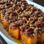 Delightful candied yams topped with a crunchy pecan streusel, blending textures and flavors for a heartwarming dish.