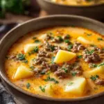 A creamy, hearty soup featuring ground beef and cheddar cheese, perfect for chilly days and weeknight dinners.