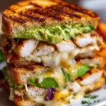 A comforting sandwich featuring grilled chicken, creamy avocado, and melted cheese on crispy, golden bread.