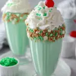- Serve: Pour the shake into your chilled glasses. Top with whipped cream, a maraschino cherry, and green sprinkles. Enjoy immediately!
