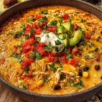 Now, it’s time to build the base of your dish. Pour in the chicken broth, red enchilada sauce, fire-roasted diced tomatoes, and green chiles. Stir all these beautiful ingredients together until well combined. Bring the mixture to a gentle simmer. This step is crucial as it allows all the flavors to blend together. As you stir, imagine the warmth and taste developing! Let it simmer for a few minutes so that the vibrant ingredients can dance together in the pot.