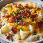 A creamy, comforting potato soup brimming with cheddar cheese and crispy bacon, perfect for chilly evenings.