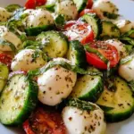 - It balances textures: crunchy cucumbers, creamy mozzarella, and a slick, aromatic dressing.