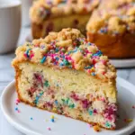 A nostalgic and festive cake featuring a tender crumb filled with rainbow sprinkles and topped with a buttery, crunchy crumb.