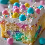 A delightful and colorful dessert perfect for Easter celebrations, featuring a moist vanilla cake soaked in jello and topped with whipped cream and sprinkles.
