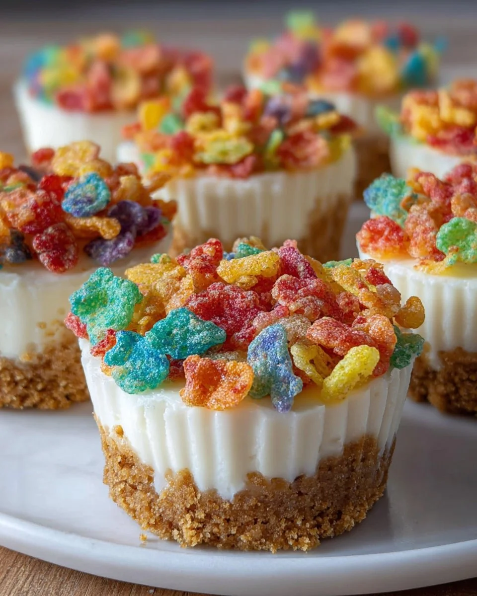 Delicious mini cheesecakes featuring Fruity Pebbles for a nostalgic crunch, set in a buttery graham cracker crust.