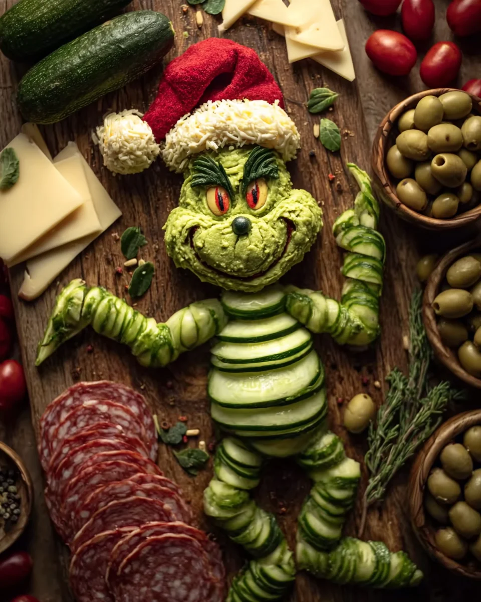 - Arrange optional extras such as salami, green olives, crackers, or cheese cubes around the Grinch for added variety.