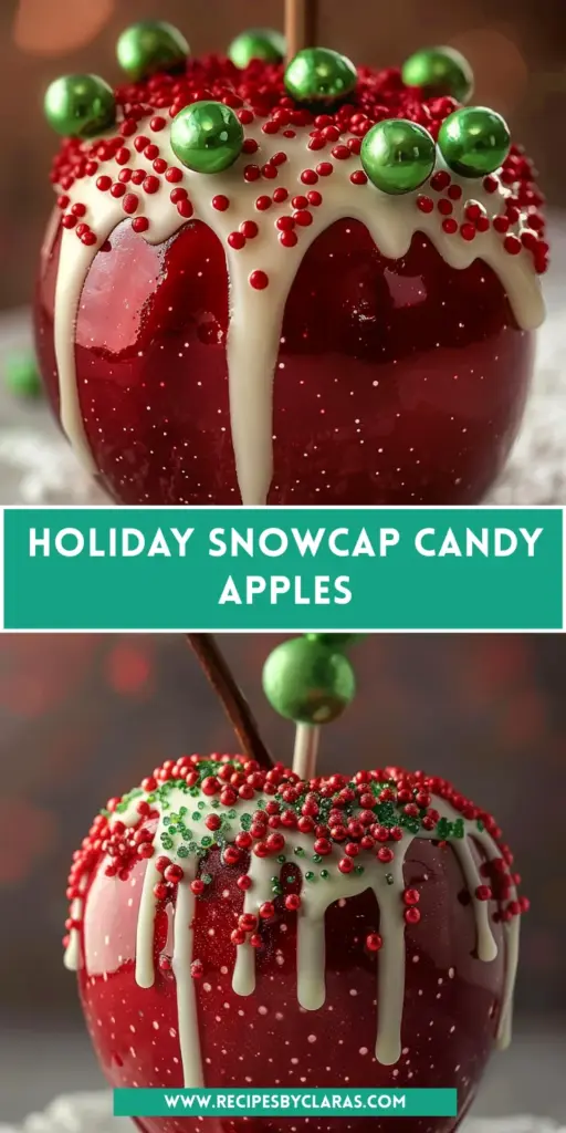 Holiday Snowcap Candy Apples are a festive treat decorated with a candy coating, white chocolate, and colorful sprinkles, perfect for the holiday season.