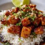- Assemble your dish: Scoop the fluffy coconut rice into bowls, topping each with a generous serving of spicy maple chicken. Garnish with fresh cilantro, lime wedges, toasted coconut flakes, and sliced green onion for a perfect finishing touch.