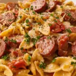 A creamy, smoky pasta dish featuring tender pasta and flavorful smoked sausage, perfect for comforting family dinners.