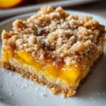 The first bite cracks with a buttery, golden crumble that gives way to tender, juicy peaches warmed with cinnamon and a whisper of vanilla. Steam lifts from the pan in a comforting cloud, carrying the aroma of summer fruit and brown sugar nostalgia. Each square balances a crisp, sandy crust with soft, syrupy filling—an effortless mash-up of pie and bar that begs for another forkful.
