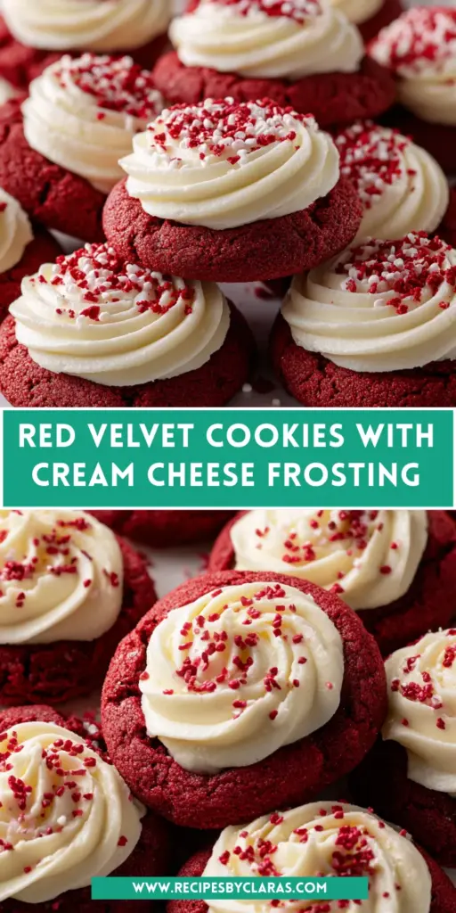 Delicious red velvet cookies topped with creamy cheese frosting, perfect for any occasion.