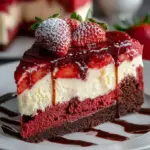 A decadent red velvet cake layered with creamy cheesecake and fresh strawberries, perfect for any special occasion.