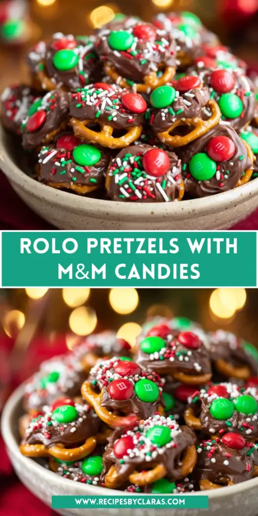 Deliciously sweet and salty Rolo Pretzels topped with M&M candies for a tasty treat.