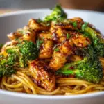 A quick and filling bowl featuring spicy garlic chicken, broccoli, and noodles, perfect for weeknight meals and meal prep.