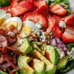Beyond flavor, this salad stands out because it mixes familiar comforts with seasonal freshness. You get the nostalgia of a Cobb—protein and bold flavors—reimagined with strawberries and avocado. It keeps well in concept too: components can be prepped ahead, so you throw everything together when guests arrive and spend more time around the table than in the kitchen.
