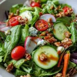 The greens form the salad’s vibrant base, while the cucumber brings refreshing crispness, and juicy cherry tomatoes add a pop of sweetness. Radishes inject a touch of sharpness, and carrots invite a slight earthiness, creating a balanced flavor profile. For added crunch, sprinkle on toasted nuts, and for a creamy finish, fold in crumbled feta. Feel free to substitute other greens or nuts based on personal preference; this recipe allows for delightful customization to suit your taste!