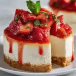 Assemble and serve: Once the cheesecake is chilled and set, gently spread the macerated strawberries over the top, spooning some of the syrup for a glossy finish. Carefully remove the sides of the springform pan, revealing a stunning cheesecake crowned with vibrant strawberries. Use a warm, wet knife to slice smoothly for serving.