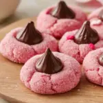 These Strawberry Kiss Cookies are soft, pink, and sweet, topped with a chocolate kiss for a delightful treat.