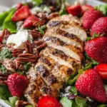 A vibrant salad with juicy grilled chicken, fresh strawberries, and crunchy toasted pecans, all dressed in a creamy pecan-butter vinaigrette.
