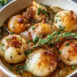 A comforting dish featuring tender whole onions simmered in a flavorful broth with garlic and herbs.