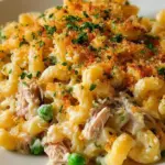 The first spoonful always surprises me — a warm, velvety ribbon of cheddar-mushroom cream that clings to tender elbow macaroni, punctuated by the subtle, salty bite of tuna and the bright pop of green peas. The top gives way to a golden, buttery crunch that sings against the silky interior. One bite brings nostalgia and comfort, the kind of cozy satisfaction that fills the kitchen with inviting aromas and makes everyone come closer to the table.