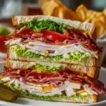 As you bring everything together, the aroma of bacon fills the air, mingling with the fresh scent of ripe tomatoes and fragrant lettuce. Your stomach begins to rumble, an impatient reminder of the feast that awaits. Each layer of turkey breast, perfectly seasoned and deli-thin, sits waiting to be embraced by creamy mayonnaise and tangy Dijon mustard, creating a symphony of flavors that dance across the palate. This isn’t just any club sandwich; this is a celebration of freshness, crunchiness, and sheer indulgence.